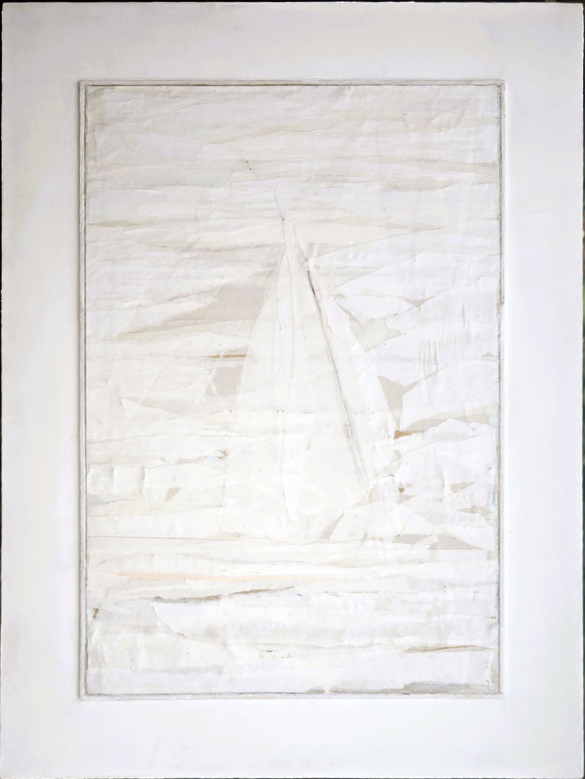 Created with hand-torn paper layered on board and sealed with wax medium, Beyond Tiburon embodies the quiet motion of departure. The abstract composition blurs boundaries, where direction is felt more than seen—evoking the profound experience of sailing just beyond the harbor at Tiburon.
